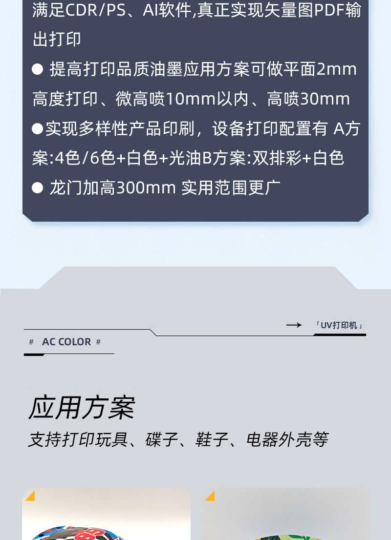 AC-2513加高30cm高落差uv平板打印機可打印高落差值已經(jīng)高達(dá)30mm,這在uv平板打印機同行業(yè)中行業(yè)應(yīng)用解決方案中,廣州潤彩這臺高落差平板打印機算是技術(shù)性突破的存在,可解決高落差特別是鞋子玩具等凹凸面特別深的行業(yè)一直困擾著