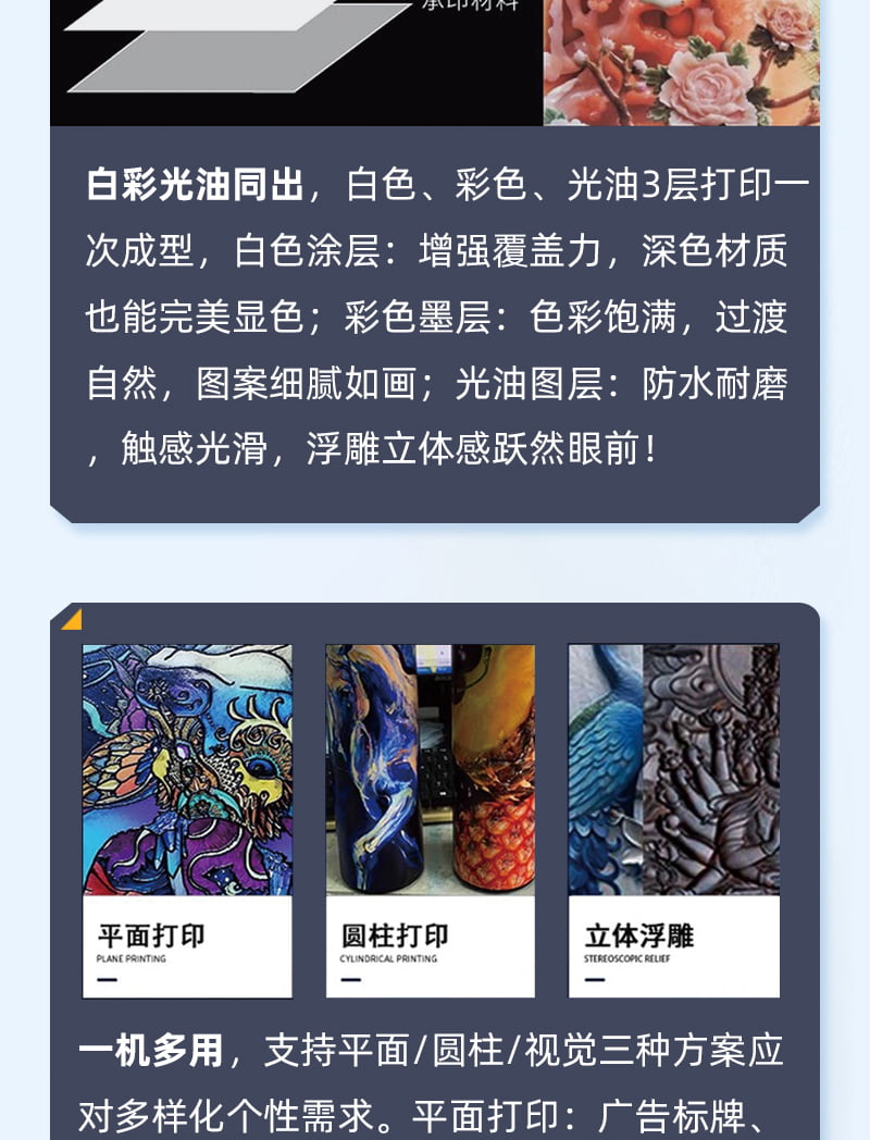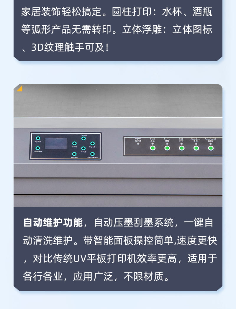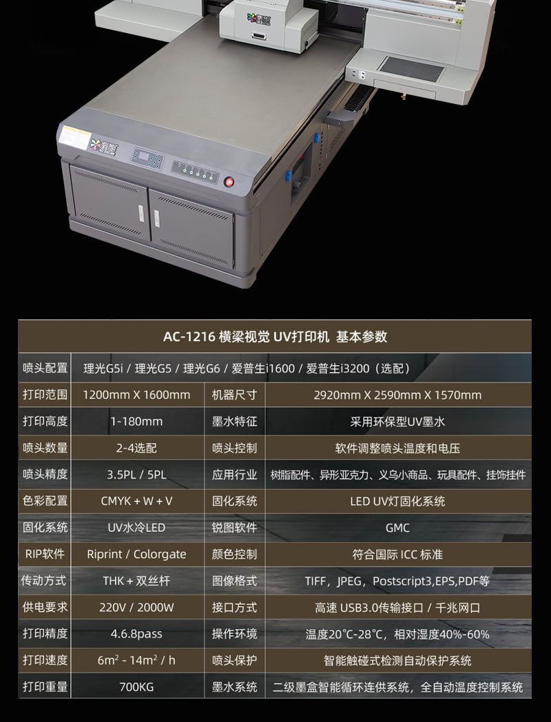 AC1216視覺uv打印機(jī)作為一臺具有高性價比uv平板打印機(jī),自研發(fā)成功推出以來,深受各大加工廠和生產(chǎn)廠家的喜愛,特別是平圓一體功能的完美體現(xiàn),再加上是小型平板一體打印機(jī),使用上更加靈活方便,不像大型平板打印機(jī)一樣必需要準(zhǔn)備足夠大的空間擺放機(jī)器,而且在打印速度和效率上1216平板打印機(jī)完全不比大型uv打印機(jī)遜色,再加上平板和圓柱體同時支持,這樣就能大大地減少成本,比如產(chǎn)品除了平面以外還有圓形的,如果不具備同時打印支持,只能再購買一臺圓柱體打印機(jī)了,這樣無論在成本上還是在使用效率上相對于非大批量生產(chǎn)的廠家而言,無疑是不夠人性化的。