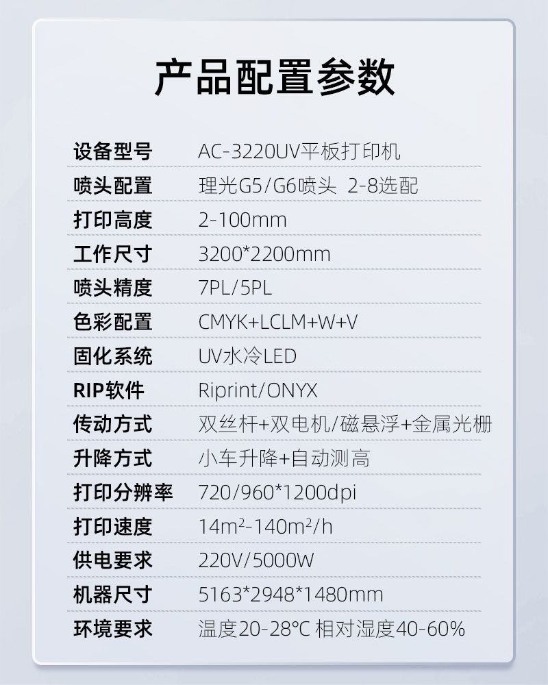 3220平板打印機價格是多少?有的時候這個問題傲彩機械的銷售同事每天都會遇到這樣的問題無數次,其實如果客戶沒有意向,怎么可能會向你詢問價格,那么其實在價格上我們有優(yōu)勢以外,其實更重要的是質量和售后都是非常的不錯,畢竟有實力的uv打印機廠家其實并不多,傲彩就是其中一個,那么下面為大家介紹這款機器的詳細參數和價格。